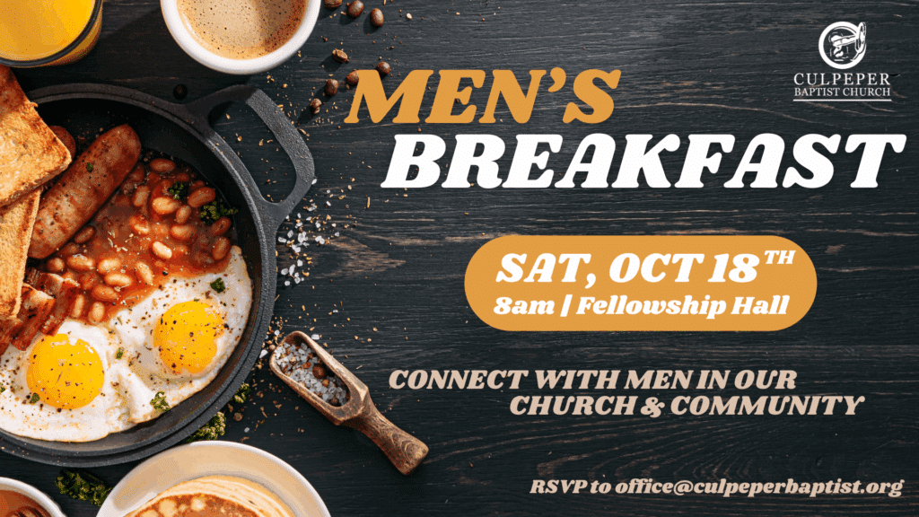 Men's Breakfast – September 20 October 14, 2025 Join us for our monthly men's breakfast at 8:00 a.m. in the Fellowship Hall. Please RSVP to office@culpeperbaptist.org - Bring a friend! Share this: