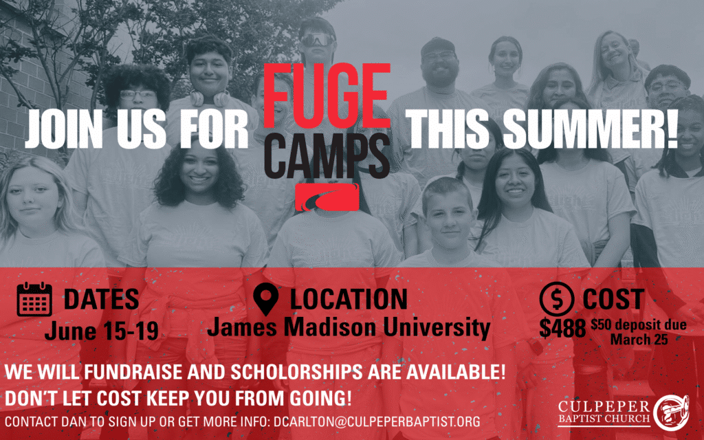 June 15-19, James Madison University February 4, 2026 FUGE is for 6-12th graders - to sign up or find out more talk to Danny, Caleb or Dan. Share this: