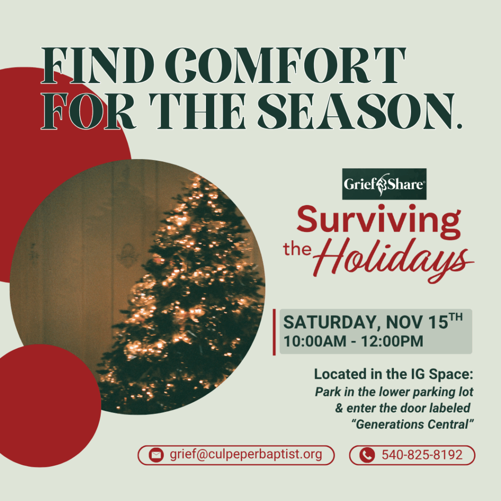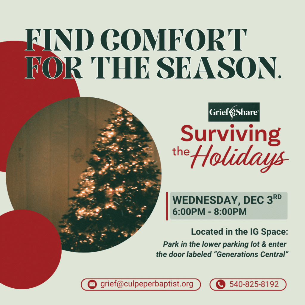 Interested? Want to know more? Send us an email at grief@culpeperbaptist.org. We look forward to connecting with you!