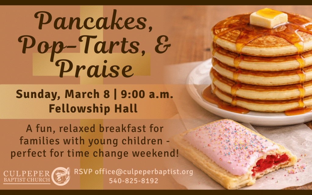 Sunday, March 8, 9:00 a.m. February 25, 2026 SPRING AHEAD and join us for breakfast! Contact the office (office@culpeperbaptist.org) or Jeanine and Maria to let us know you are coming. Share this:
