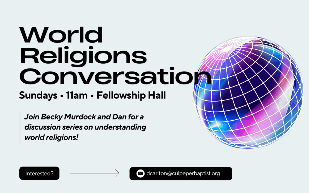 Ever wonder what your neighbors believe or how different faiths shape our world?  Come join us on Sunday mornings at 11:00 a.m. in the Fellowship Hall for a relaxed, engaging conversation led by Dan and Becky Murdock.  Each week, we’ll explore a different belief system and talk about what we can learn from one another.